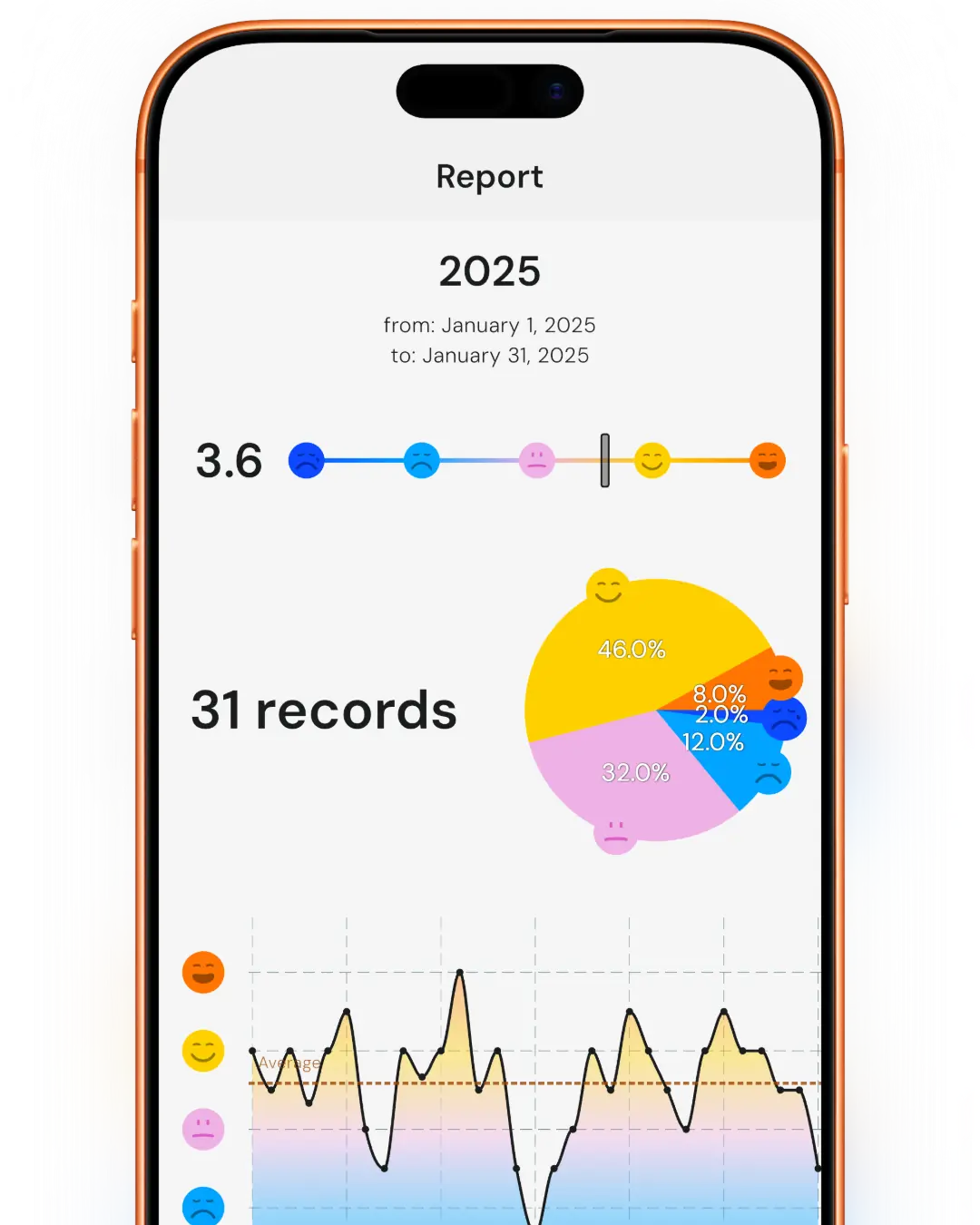 Gain insights with statistics and beautifully crafted graphs that provide a bird's eye view of your mood patterns.